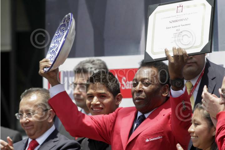 PUEBLA, PUEBLA, 20MAYO2014.- El ex-futbolista e ícono del fútbol mundial, Edson Arantes Do Nascimiento "Pelé", visitó la Universidad Popular Autónoma de Puebla UPAEP, para ofrecer una conferencia motivacional en la que abordó sus experiencias personales y futbolísitcas ante cientos de estudiantes e invitados que abarrotaron la explanada de la universidad. FOTO: HILDA RÍOS / CUARTOSCURO.COM