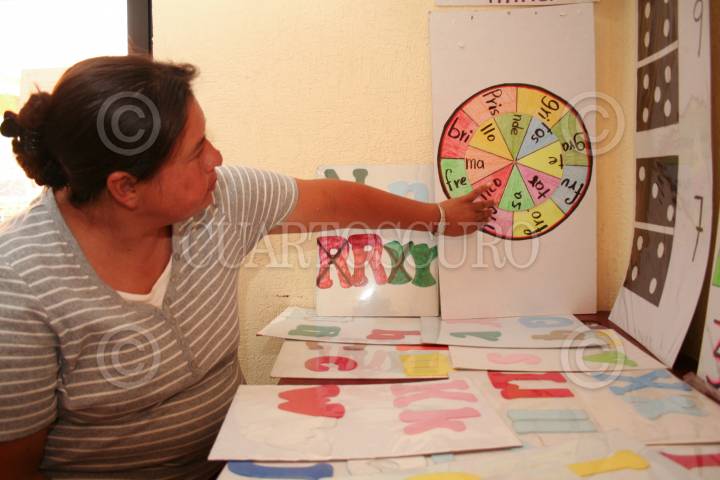 CHIMALHUACÁN, EDOMEX, 22JUNIO2008.- Las alfabetizadoras María Félix Romero y Dulce María Razo, oriundas del lugar, inventaron un método innovador de enseñanza con una serie de materiales didácticos diseñados por ellas mismas, lo que les ha permitido un mejor enseñanza a sus alumnos así como un mejor aprovechamiento por parte de ellos. El instrumento consiste en un disco de las trilíteras que al girarlo y hacer que los colores coincida forma palabras. FOTO: MARIO NULO/CUARTOSCURO.COM