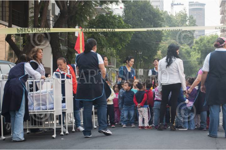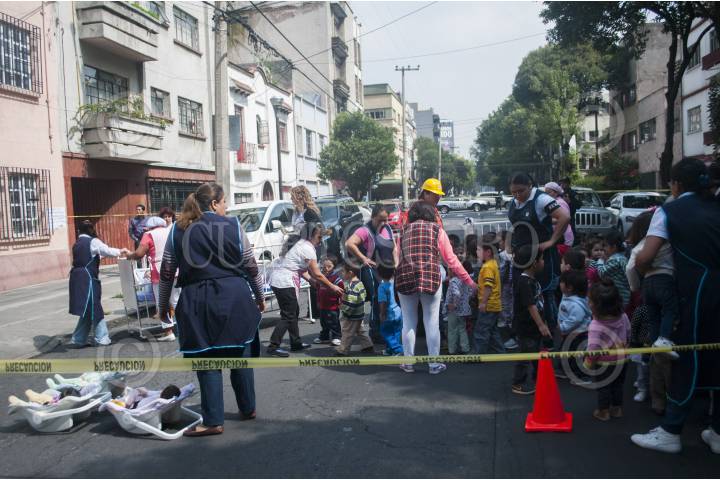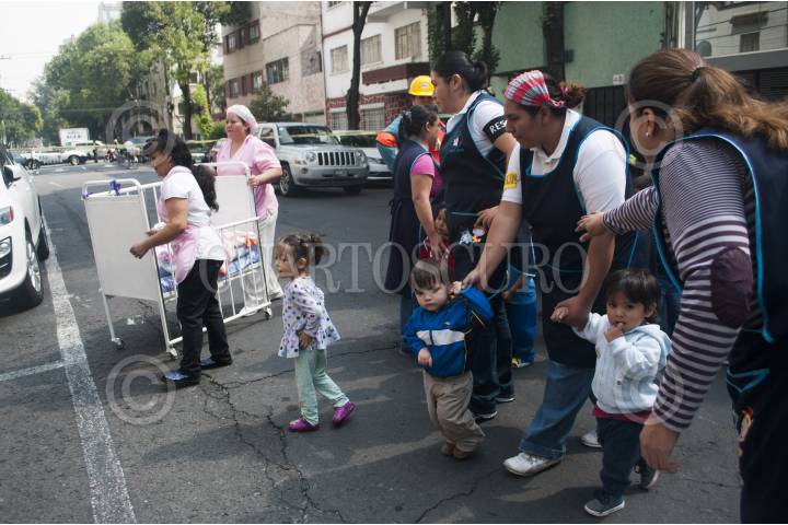 MÉXICO, D.F., 11JULIO2014.- Maestras de una guardería que se encuentra en la calle Rio Tigris en la colonia Cuahtémoc, realizaron un simulacro para prevenir cualquier sismo e incendio en compañía de los menores que se organizaron sobre la avenida, misma que fue acordonada por la policía capitalina. FOTO: DIEGO SIMÓN SÁNCHEZ /CUARTOSCURO.COM