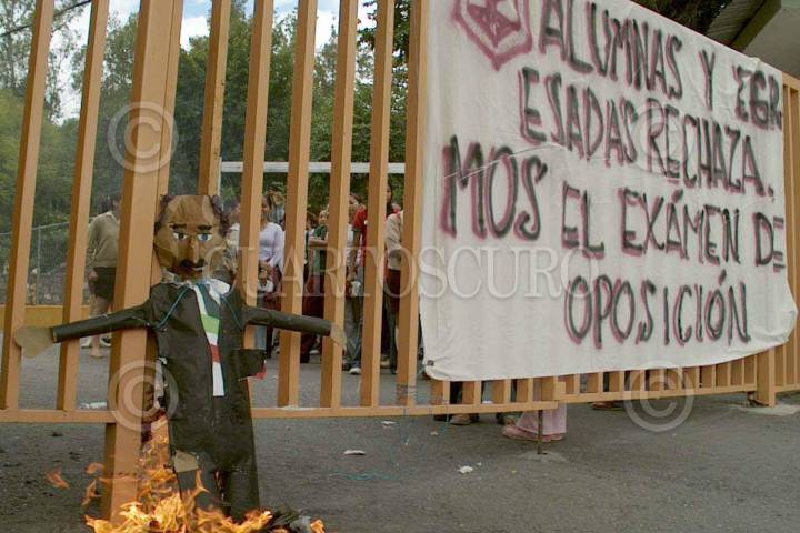 Chilpancingo, Guerrero 07 OCTUBRE 2004.- Estudiantes de la normal para educadoras Adolfo Viguri Viguri realizaron protestas en sus instalaciones quemando monigotes que representaban al gobernador Rene Juárez Cisneros y al secretario de educacion Daniel Pano Cruz. Foto: Oscar Alvarado/CUARTOSCURO.COM