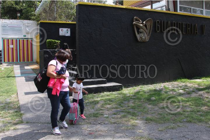 Una madre camina acompañada de su hija, luego de recogerla de la Guardería V del IMSS.