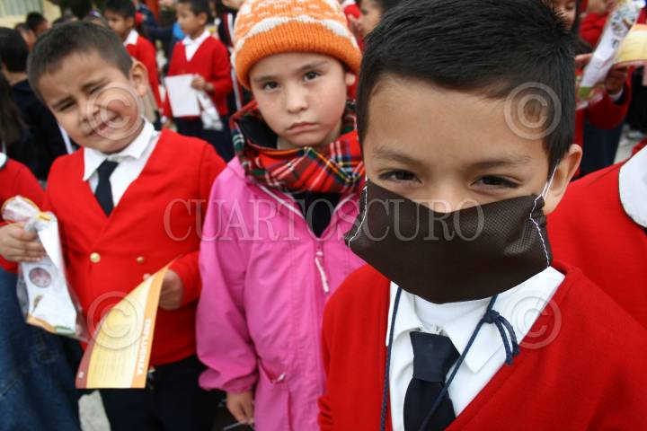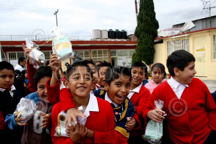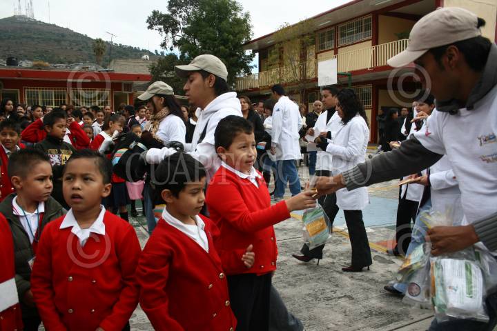 MÉXICO, D.F., 06NOVIEMBRE2009.- Niños de la Escuela Primaria Rafael Molina Betancourt, reciben un kit de limpieza en el patio de su escuela donde se dio inicio a la camapa de reforzamiento de limpieza de planteles Educativos que tiene como fin evitar el contagio del virus AH1N1. FOTO: SÁSHENKA GUTIÉRREZ/CUARTOSCURO.COM