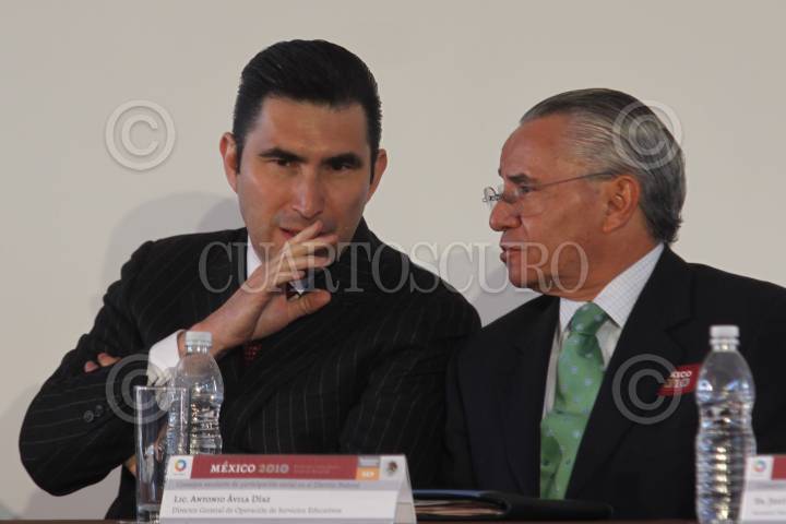 MÉXICO, D.F., 30SEPTIEMBRE2010.- Fernando González, subsecretario de la Secretaria de Educación Pública, (yerno de Elba Esther) conversa con Antonio Ávila, director general de operación de servicios educativos durante la presentación de los Consejos Escolares de Participación Social en el Distrito Federal que se realizo en la escuela primaria República de Costa Rica. FOTO: RODOLFO ANGULO/CUARTOSCURO.COM