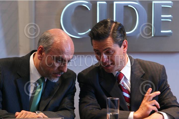 MÉXICO, D.F., 17ABRIL2009.-Enrique Cabrero, director del (CIDE) conversa con Enrique Peña Nieto, gobernador del Estado de México, durante el Congreso de Victimizacion y Eficacia Institucional que se celebro en el Centro de Investigación y Docencia Económicas (CIDE). FOTO: RICARDO CASTELAN/CUARTOSCURO.COM