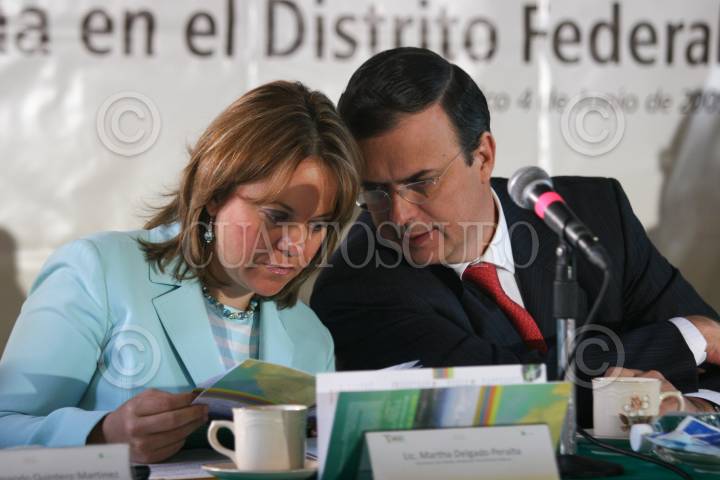 MÉXICO, D.F., 04JUNIO2009.- Martha Delgado secretaria de Medio Ambiente de la capital y Marcelo Ebrard jefe de gobierno capitalino, durante la presentación de el Plan de acción para el uso eficiente de la energía en el Distrito Federal, el cual incluye la sustitución de microbuses, la reducción de 82 mil toneladas la emisión de dióxido de carbono por acciones aplicadas al sector transporte. FOTO: RICARDO CASTELAN/CUARTOSCURO.COM
