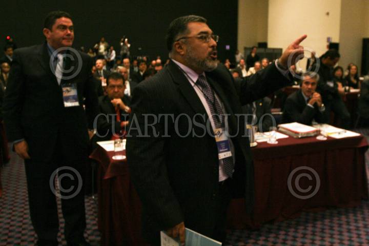 MÉXICO, D.F., 27SEPTIEMBRE2010.- Pedro Velazquez, ex trabajador de la extinta compañía de Luz y Fuerza, irrumpió en el salón donde se encontraba Javier Lozano, Secretario del Trabajo para gritar una serie de consignas cuando se encontraban inaugurando el foro: "Por un mercado laboral mas eficiente" por lo que fue sacado por elementos de seguridad del lugar. FOTO: ENRIQUE ORDÓÑEZ/CUARTOSCURO.COM