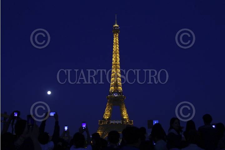 PARÍS, FRANCIA, 10AGOSTO2014.- Decenas de turistas toman la foto de la luna llena y la torre Eiffel, símbolo francés. Miles de visitantes arriban a diario a la estructura de hierro diseñada por Maurice Koechlin y Émile Nouguier y construida por el ingeniero francés Gustave Eiffel y sus colaboradores para la Exposición universal de 1889 en París. Los turistas aprovechan además que la luna se verá hasta un 16 por ciento más grande que en todo el año, fenómeno conocido como la super Luna. FOTO: ISAAC ESQUIVEL / CUARTOSCURO.COM