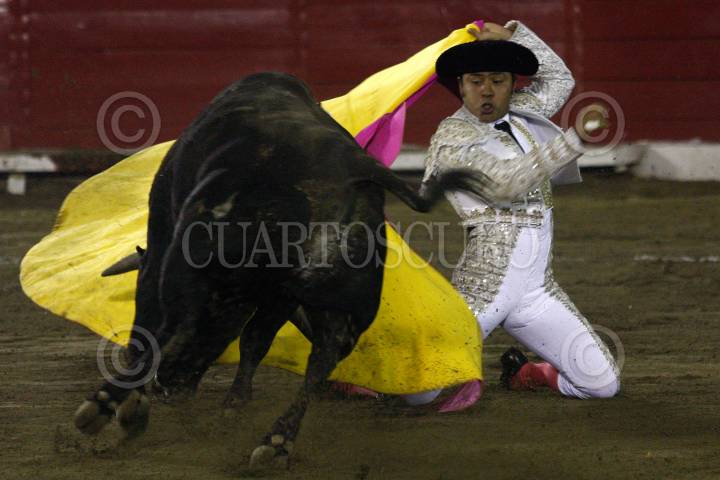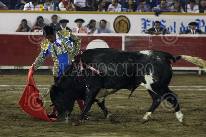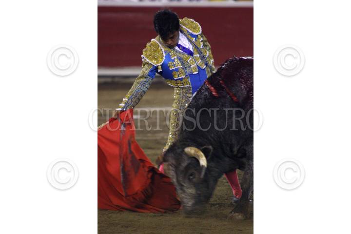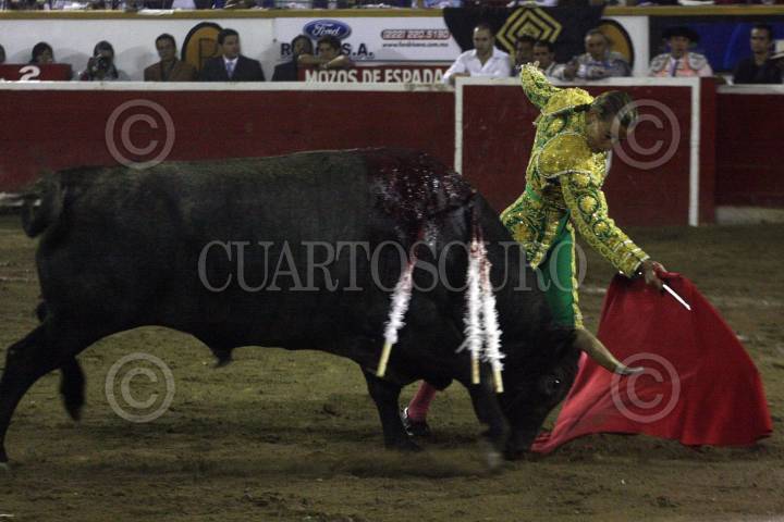PUEBLA, PUEBLA, 29MAYO2010.- El matador José Luis Angelino, obtuvo una oreja cuando bordó al ejemplar Gran Amigo, de la ganadería Reyes Huerta, en la faena realizada en memoria del empresario Gabriel Huerta Ortega que se realizo la noche de ayer en la plaza de toros El Relicario. FOTO: FRANCISCO GUASCO/CUARTOSCURO.COM