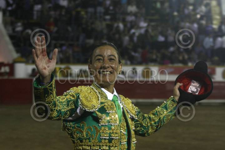 PUEBLA, PUEBLA, 20MAYO2011.- La matadora española, Mary Paz Vega, cortó un apéndice a Confiado, ejemplar de 462 kilográmos, de la ganadería San Lucas, durante el cierre de la feria taurina en la plaza de toros El Relicario. FOTO: FRANCISCO GUASCO/CUARTOSCURO.COM