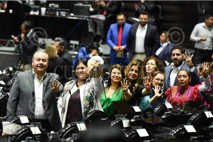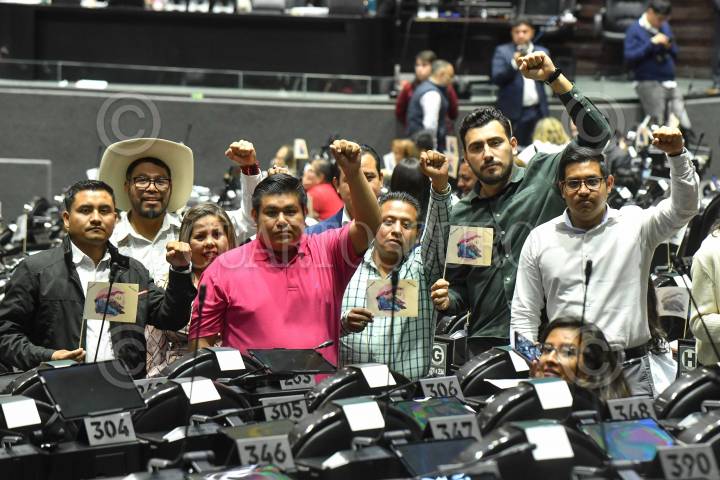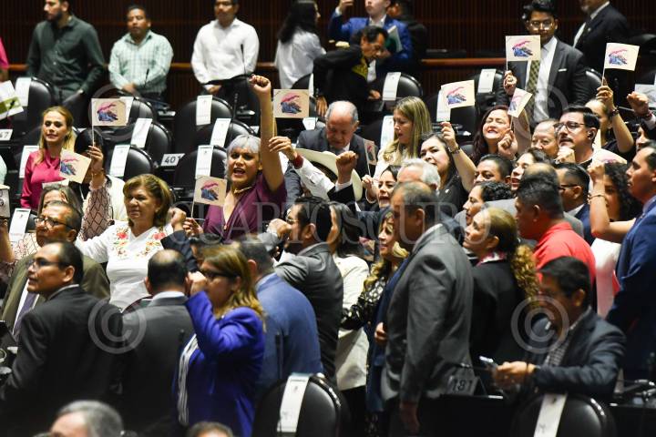 CIUDAD DE MÉXICO, 26SEPTIEMBRE2023.- Legisladores de Morena durante la sesión ordinaria de la Cámara de Diputados en la que se presentó la efeméride con motivo noveno aniversario de la desaparición de los 43 jóvenes normalistas de Ayotzinapa. FOTO: MARIO JASSO/CUARTOSCURO.COM