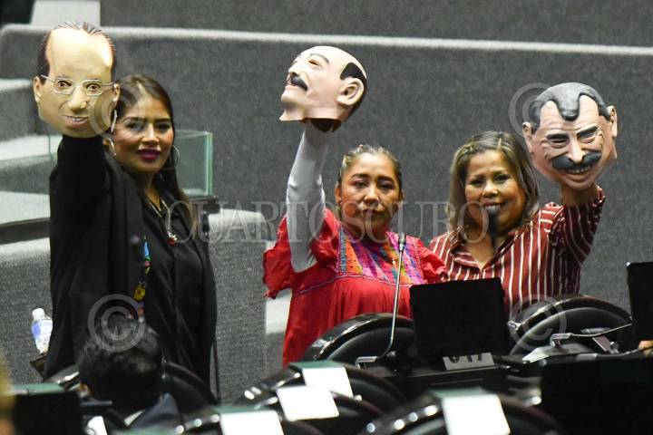 CIUDAD DE MÉXICO, 20SEPTIEMBRE2022.- Brianda Aurora Vázquez, Rosario Reyes Silva y Sandra Navarro, muestran máscaras de los expresidentes de México: Felipe Calderón, Carlos Salinas de Gortari y Vicente Fox, durante la comparecencia de Rogelio Ramírez de la O, secretario de Hacienda y Crédito Público, ante el pleno de la Cámara de Diputados. FOTO: MARIO JASSO/CUARTOSCURO.COM