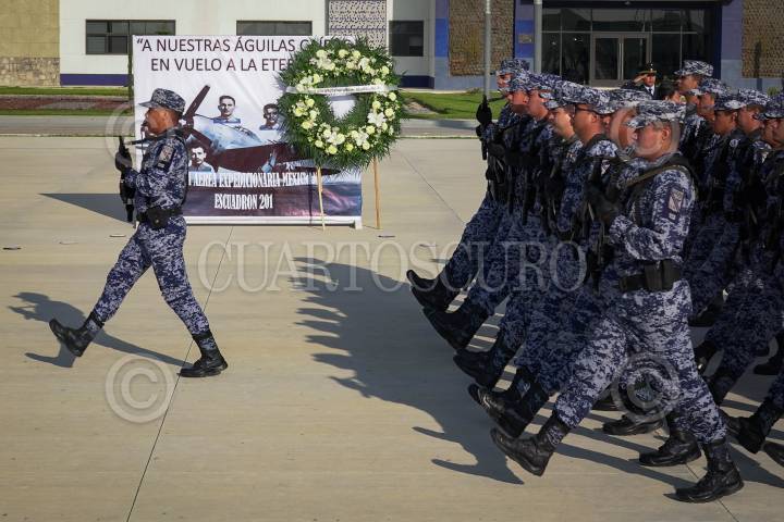 SANTA LUCÍA, ESTADO DE MÉXICO, 19NOVIEMBRE2024.- Se llevó acabo la LXXIX Ceremonia Conmemorativa del retorno a la Patria de la Fuerza Aérea Expedicionaria Mexicana, "Escuadrón 201", realizada en la explanada de la Base Militar No.1 Santa Lucía. FOTO: ROGELIO MORALES /CUARTOSCURO.COM