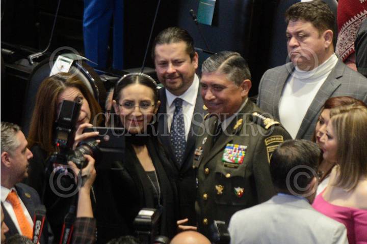 Laura Imelda Pérez, diputada de Morena, se toma una fotografía con Luis Cresencio Sandoval, secretario de la Defensa Nacional, durante la sesión solemne de la Cámara de Diputados con motivo del Día del Ejército Mexicano.