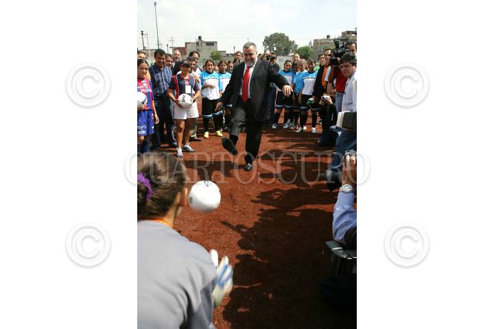 MEXICO, D.F. 02SEPTIMBRE2005.- Alejandro Encinas, jefe de gobierno de la ciudad de Mèxico da la patada iniciar en la cacha de futbol del Parkelektra Ejidal 10, en Iztapalapa. FOTO: Nelly Salas/CUARTOSCURO.COM