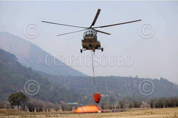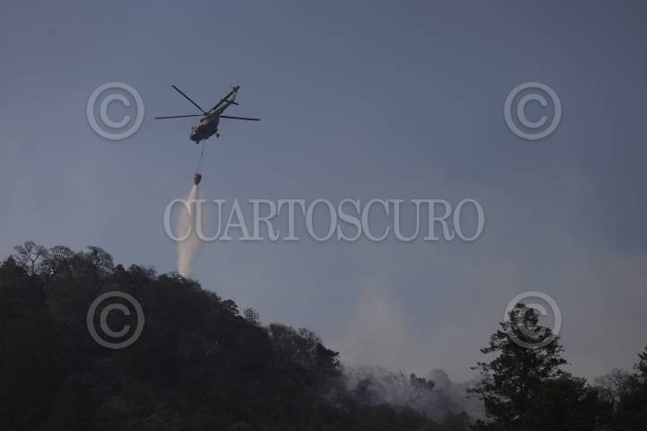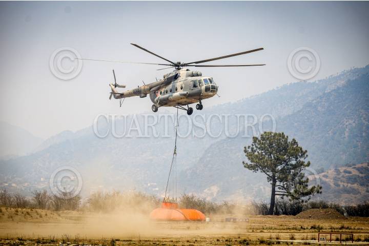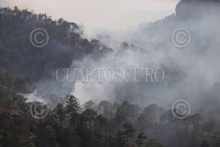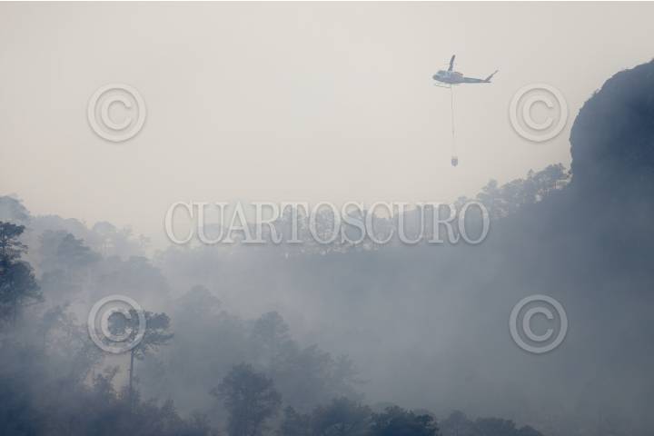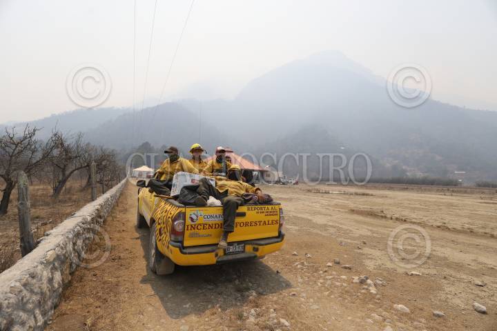 Continúan labores para combatir incendio en Sierra de Santiago en la zona conocida como ejido La Ciénaga. Fuertes vientos e intenso calor provocan la intensificación del siniestro y largas cortinas de humo.