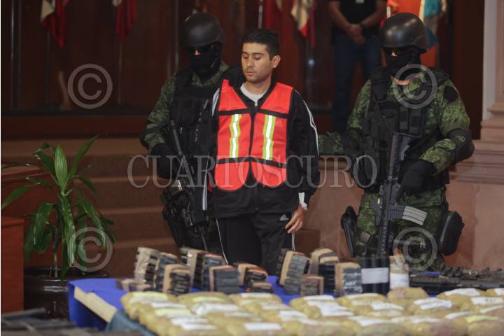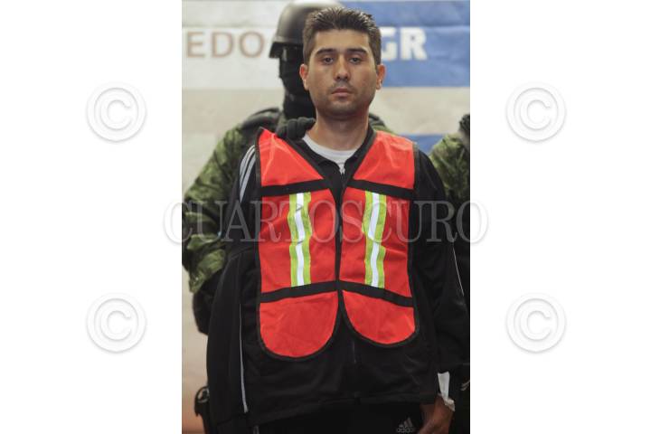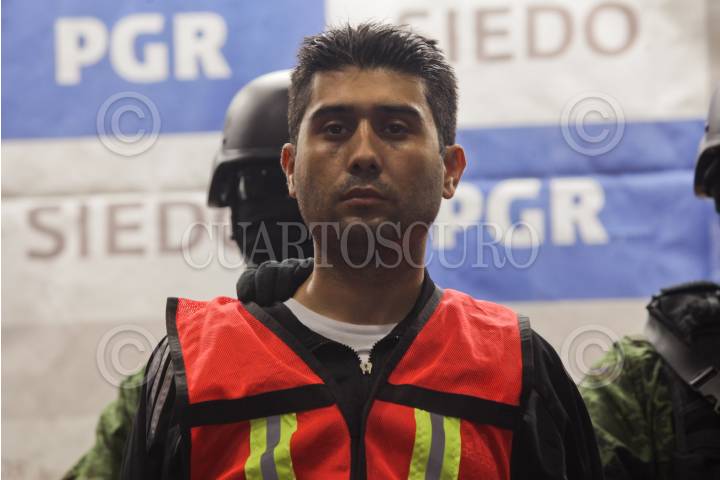 MÉXICO, DF 12MARZO2012.-El lider del Cartel Jalisco Nueva Generación, Erick Valencia Salazar, también conocido como el 85, fué presentado en la SIEDO esta mañana. Es señalado por la PGR y la SEDENA como el sucesor de Ignacio "Nacho" Coronel. "El 85" fué detenido el pasado viernes en Guadalajara en un operativo del Ejército. FOTO: JUAN PABLO ZAMORA /CUARTOSCURO.COM