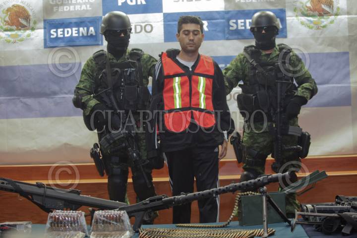 MÉXICO, DF 12MARZO2012.- Al presentar a Érick Valencia Salazar,"El 85", y sus presuntos cómplices Otoniel Mendoza, "Tony Montana", y José Luis Salazar Gutiérrez, "El Chelis", la PGR informó que ha solicitado una orden de arraigo de 40 días contra los implicados y que está por ser resuelto en las próximas horas. En el lugar fueron aseguradas seis armas cortas, 37 largas, incluidos 19 fusiles AR-15 con aditamento lanzagranadas, dos ametralladoras y dos fusiles Barret. También tres granadas, 119 cargadores, 69 mil cartuchos, tres silenciadores, equipo de comunicación, vestuario apocrifo de la Policia Estatal de Jalisco. FOTO: JUAN PABLO ZAMORA /CUARTOSCURO.COM