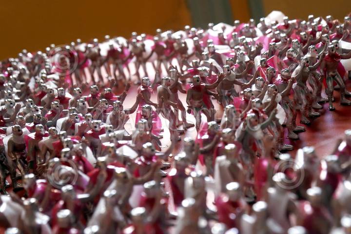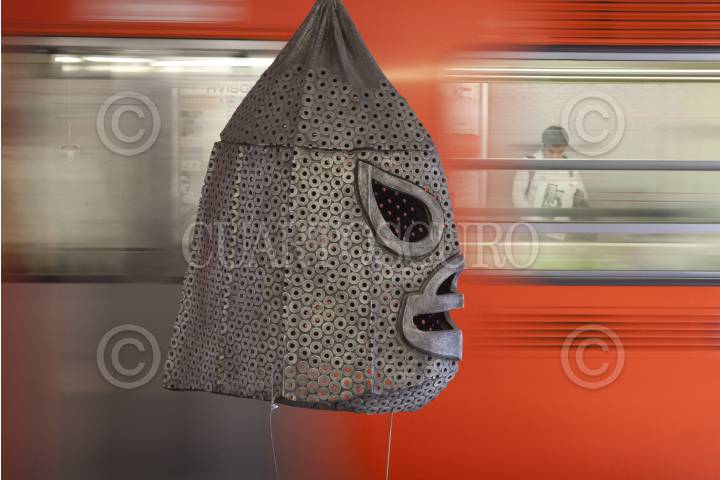 MÉXICO, D.F., 14MAYO2012.- Una máscara de gran tamaño del famoso luchador, el Santo, es parte de una exposición de personajes y artistas mexicanos que se encuentra en los andenes del metro Salto del Agua. FOTO: ADOLFO VLADIMIR/CUARTOSCURO.COM