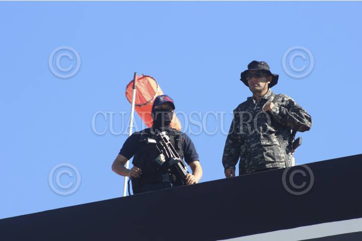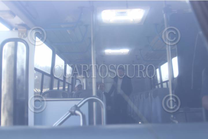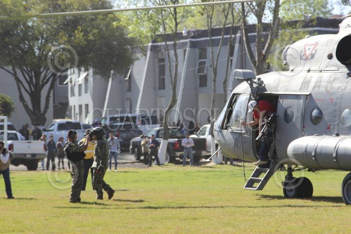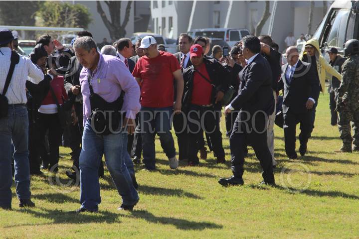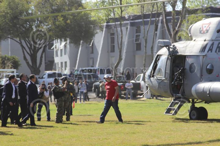 MORELIA, MICHOACÁN, 3ODICIEMBRE2014.- Luis Antonio Torres “El Americano” llegó hace unos minutos a Morelia en un helicóptero de la Marina Armada de México, tripulado también por el procurador general de Justicia del Estado, José Martín Godoy Castro y nueve de sus hombres, con quienes se entregó esta mañana a la justicia, en Buenavista Tomatlán. La aeronave aterrizó en las instalaciones de la Procuraduría General de Justicia del Estado únicamente para que descendieran Luis Antonio Torres y sus nueve hombres e inmediatamente fueron subidos a un camión suburbano que los trasladó al Cereso “David Franco Rodríguez” conocido como Mil Cumbres, donde serán puestos a disposición del juez que los reclama. FOTO: JUAN JOSÉ ESTRADA SERAFÍN /CUARTOSCURO.COM