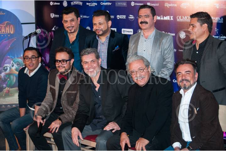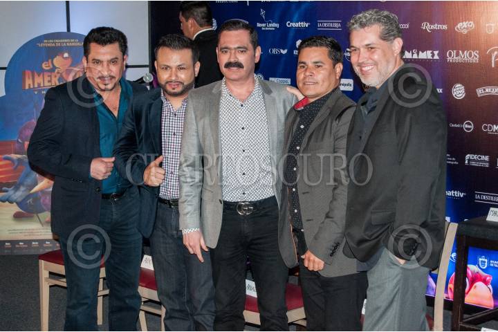 MÉXICO, D.F., 19ENERO2016.- El grupo norteño Los Tucanes de Tijuana, Adal Ramones, Aleks Syntek, Edward James Olmos, Pierre Angelo, durante la conferencia de prensa para presentar la película animada "El Americano", dirigida por Ricardo Arnaiz, la cual se estrena el próximo 22 de enero en todo el país. FOTO: DIEGO SIMÓN SÁNCHEZ /CUARTOSCURO.COM