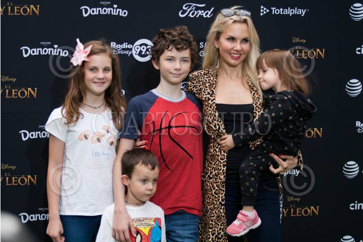 CIUDAD DE MÉXICO, 14JULIO2019.- La actriz Michelle Vieth acompañada de sus hijos durante la alfombra roja de la nueva película Live Action del Rey León, en el centro comercial Parque Toreo. FOTO: GALO CAÑAS /CUARTOSCURO.COM