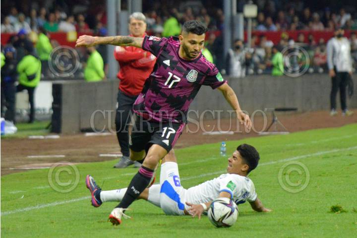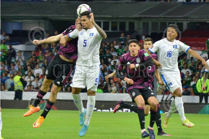 Raúl, delantero de la Selección Nacional Mexicana, remata el balón frente a la marca de Roland Gómez, defensa de la Selección Nacional de El Salvador, en partido correspondiente a las eliminatorias rumbo a la Copa del Mundo Qatar 2022.