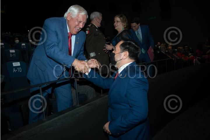 Víctor Manuel Villalobos, secretario de Agricultura y Desarrollo Rural, saluda a Arturo Reyes Sandoval, Director General del Instituto Politécnico Nacional (IPN) durante la presentación la serie documental “México en Centroamérica: Latidos de hermandad".