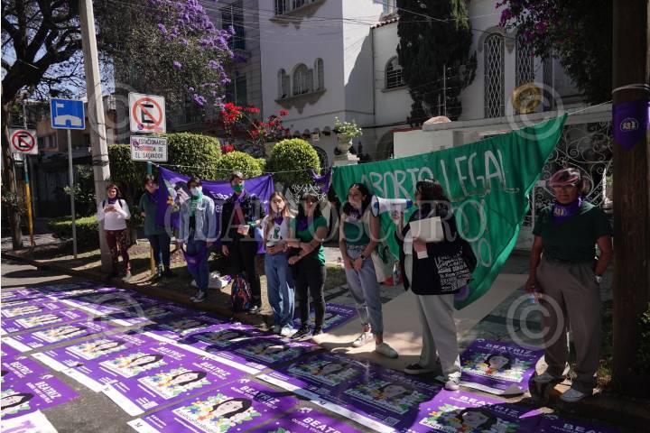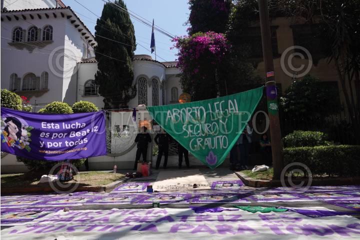 Integrantes de colectivas feministas protestaron para exigir justicia en la Embajada de El Salvador por el caso de Beatriz, una mujer salvadoreña de 21 años con la enfermedad de lupus que tuvo su primer hijo de alto riesgo y al año siguiente le diagnosticaron otro embarazo, el cual exigió su interrupción y el estado le negó