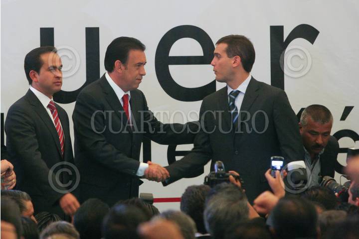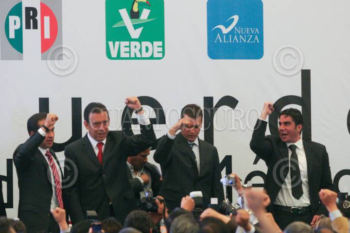 TOLUCA, ESTADO DE MÉXICO, 23MARZO2011.- Ricardo Aguilar, presidente del PRI en el Estado de México, Humberto Moreira, presidente del PRI Nacional, Jorge Emilio Gonzalez Martinez, presidente del Partido Verde Ecologista Y Jorge Kahwagi de Nueva Alianza, firmaron un acuerdo político para efectuar una alianza con miras a las elecciones para la gubernatura del Estado de México. FOTO: SAÚL LÓPEZ/CUARTOSCURO.COM
