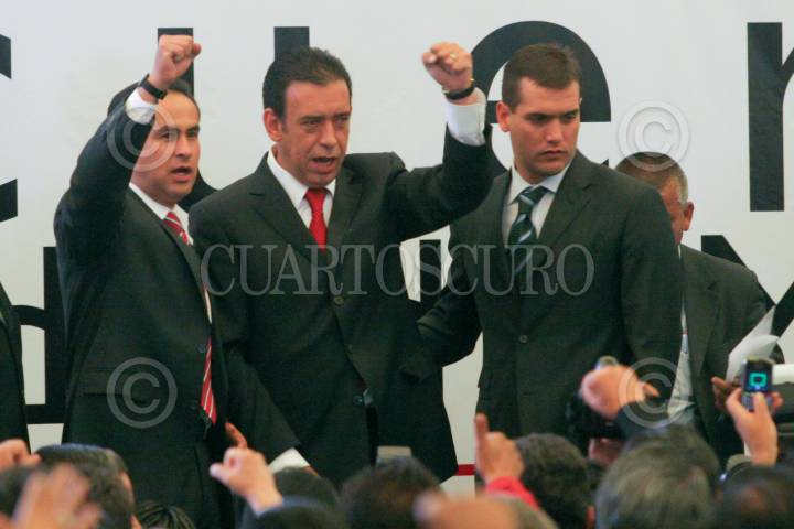 TOLUCA, ESTADO DE MÉXICO, 23MARZO2011.- Ricardo Aguilar, presidente del PRI en el Estado de México, Humberto Moreira, presidente del PRI Nacional y Jorge Emilio Gonzalez Martinez, presidente del Partido Verde Ecologista, firmaron un acuerdo político para efectuar una alianza con miras a las elecciones para la gubernatura del Estado de México. FOTO: SAÚL LÓPEZ/CUARTOSCURO.COM