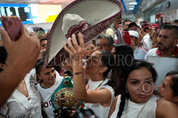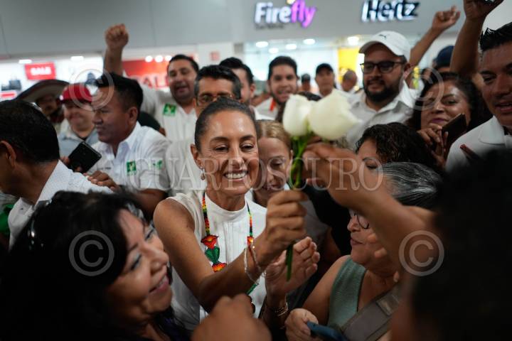 Claudia Sheinbaum durante su recepción en el Aereopuerto de Puerto Vallarta, Jalisco.