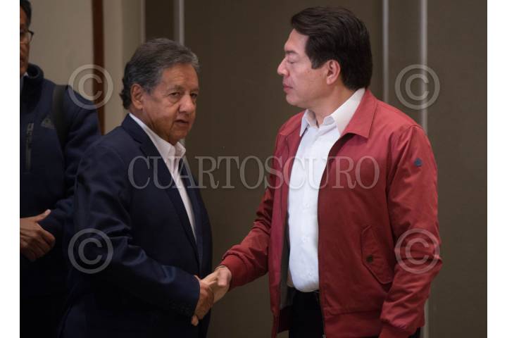 Los dirigentes nacionales Mario Delgado (Morena) y Alberto Anaya (PT), durante conferencia en la que anunciaron el apoyo del Partido del Trabajo a Armando Guadiana, candidato a la gubernatura de Coahuila y la unidad de ambos partidos para el proceso electoral de 2024.