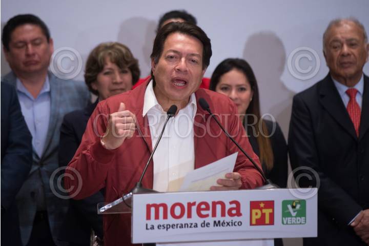 Mario Delgado, dirigente nacional de Morena, durante su intervención en la que se confirmó la alianza para las elecciones para la gubernatura del Estado de México con la candidata Delfina Gómez, y de las elecciones presidenciales de 2024.