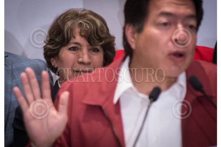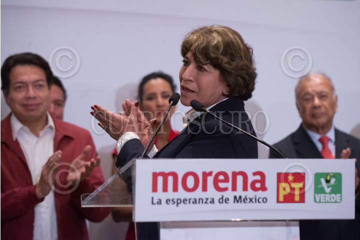 Delfina Gómez, candidata a la gubernatura del Estado de México, durante intervención de Mario Delgado, dirigente nacional de Morena, en la que se confirmó la alianza para las elecciones para la gubernatura del Estado de México con la candidata Delfina Gómez, y de las elecciones presidenciales de 2024.