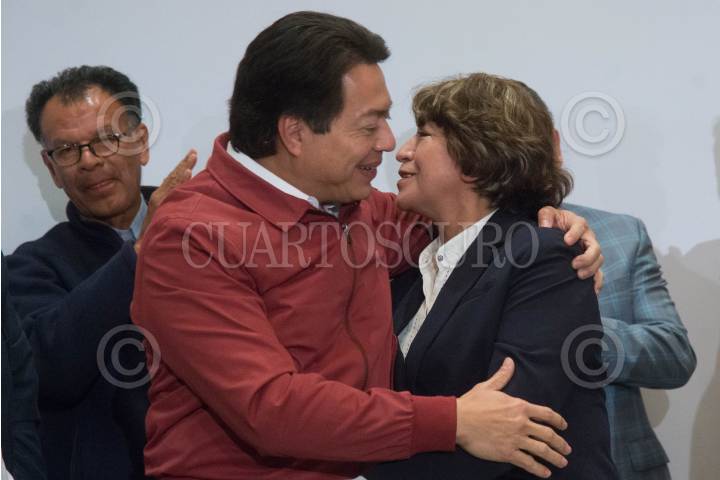 Mario Delgado, dirigente nacional de Morena, abraza a Delfina Gómez, candidata a la gubernatura del Estado de México, durante el anuncio de la alianza de Morena-PT-PVEM para las elecciones de gobernador del Estado de México.