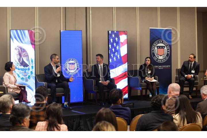CIUDAD DE MÉXICO, 27NOVIEMBRE2024.- Juan Pablo de Leo, periodista; Estefanía Cruz alera, doctora en política Pública; Larry Rubin, Presidente de American Society of Mexico; Daniel Saga, economista; Brenda Garcia, económica durante el conversatorio Análisis post electoral EE.UU. donde se abordó el panorama económico, político y social de la relación bilateral entre México y Estados Unidos, en el contexto de los nuevos gobiernos encabezados por la presidenta Claudia Sheinbaum y el presidente electo Donald Trump. FOTO: ANDREA MURCIA /CUARTOSCURO.COM