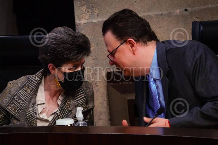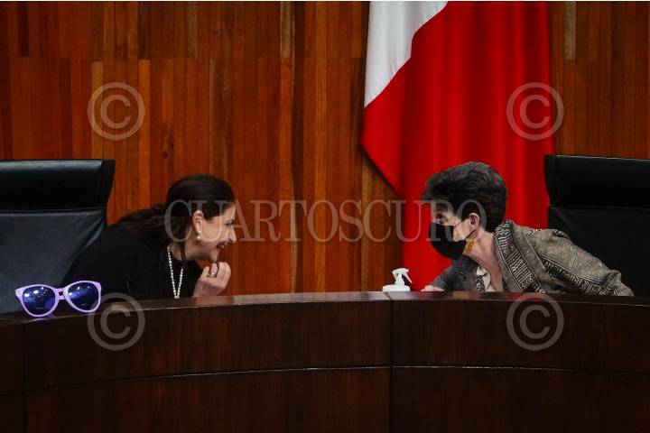 CIUDAD DE MÉXICO, 08AGOSTO2024.- Mónica Aralí Soto, magistrada presidenta y Janine M. Otálora, magistrada del TEPJF, dialogan durante la sesión pública del Tribunal Electoral del Poder Judicial de la Federación. FOTO: ROGELIO MORALES /CUARTOSCURO.COM