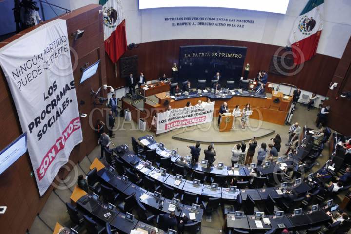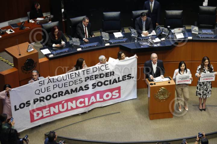 CIUDAD DE MÉXICO, 03ABRIL2024.- Los senadores panistas mostraron cárteles con la leyenda "Si alguien te dice que puedes perder los programas sociales denúncialos" y "Los programas sociales son tuyos" durante la sesión en la Cámara de Senadores. Los parlamentarios auriazules acusan al partido de Morena de emprender una campaña en la cual afirman que si gana la candidata presidencial de la oposición pueden perder estos beneficios. FOTO: CUARTOSCURO.COM