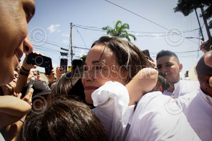CARACAS, VENEZUELA, 28JULIO2024.- María Corina Machado, líder de la oposición, acudió a ejercer su voto en la casilla ubicada en la Institución educativa Elena de Bueno. En una relativa calma, los ciudadanos venezolanos en edad de votar, han acudido a las urnas para elegir a su próximo presidente. En los distintos centros de votación en Caracas la jornada ha sucedido sin altercados. Barrios populares históricamente de apoyo chavista como El Petare y La Vega se han mantenido una jornada en paz. Gente en la calles, en la plazas públicas le dan vida y color a la capital en un día histórico para el país. FOTO: CORTESÍA/ DANNIELLY RODRÍGUEZ /CUARTOSCURO.COM