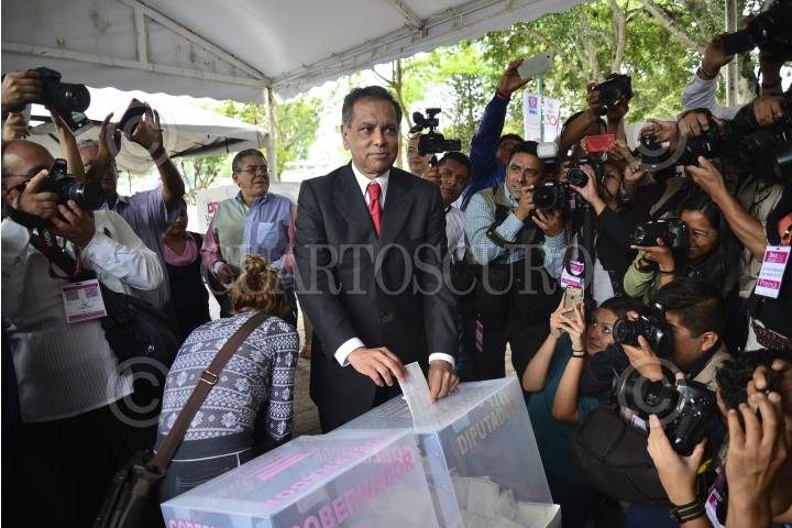 XALAPA, VERACRUZ, 05JUNIO2016.- El candidato a gobernador por el partido Movimiento Ciudadano Armando Méndez de la Luz, acompañado del dirigente nacional Dante Delgado Ranauro, emitió su voto en la casilla instalada en el "Club Británia" en la ciudad capital. FOTO: ALBERTO ROA /CUARTOSCURO.COM