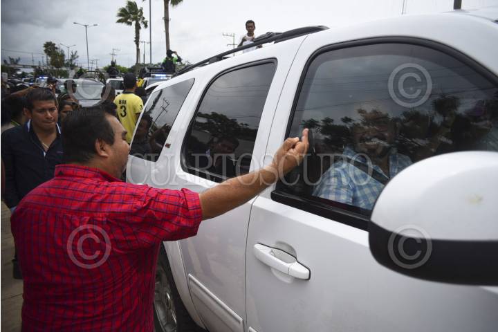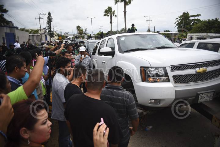 COATZACOALCOS, VERACRUZ, 05JUNIO2016.- El senador Fernando Yunes Marques, hijo del candidato a gobernador Miguel Angel Yunes Linares, por la coalición del PAN-PRD, fue trasladado a las oficinas de la PGR después de haber sido detenido por elementos de la policía estatal para una revisión de rutina a la cual se opuso. Previamente forcejeó con los militantes de otros partidos y finalmente fue trasladado en una grúa al Ministerio Público. FOTO: ÁNGEL HERNÁNDEZ /CUARTOSCURO.COM