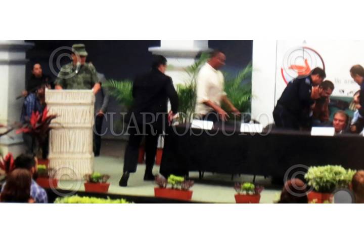 CUERNAVACA, MORELOS, 10SEPTIEMBRE2018.- José Manuel Sanz, coordinador de enlace del gobierno electo, se cayó junto con la silla que ocupaba en el estrado del evento de registro y canje de armas. Fotogramas de un video tomado con un celular. FOTO: ESPECIAL /CUARTOSCURO.COM