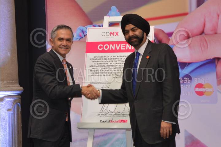 CIUDAD DE MÉXICO, 26MAYO2017.- Miguel Ángel Mancera, jefe de Gobierno, y Antonio Junco Goicoechea, presidente y director general de Mastercard para México, firmaron el convenio para impulsar la competitiva y productividad de los pequeños negocios, para que sean incorporados al sistema de pago electrónico, y puedan incrementar sus ventas. FOTO: CORTESÍA CDMX /CUARTOSCURO.COM