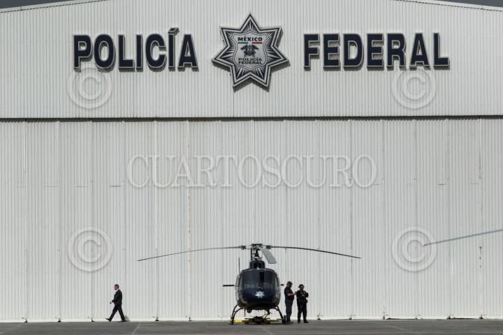 CIUDAD DE MÉXICO, 28NOVIEMBRE2018.- Elementos de la Policía Federal resguardan un helicóptero de la institución previo al inicio de la ceremonia de "Reconocimiento y fortalecimiento de capacidades policiales" que se llevó acabo en el Centro de Mando de la Policía Federal. FOTO: MISAEL VALTIERRA / CUARTOSCURO.COM