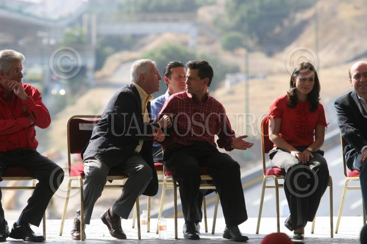 CUAUTITLAN IZCALLI, ESTADO DE MÉXICO, 24NOVIEMBRE2010.- José Andrés Oteyza Fernández, director Obrascon Huarte Lain (OHL) platica con Enrique Peña Nieto, gobernador del Estado de México, durante la inauguracion del viaducto elevado bicentenario en el tramo Lago de Guadalupe-Tepalcapa. FOTO: SAÚL LÓPEZ/CUARTOSCURO.COM