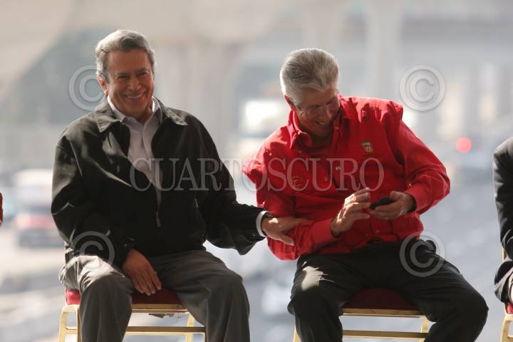 CUAUTITLAN IZCALLI, ESTADO DE MÉXICO, 24NOVIEMBRE2010.- Alfredo del Mazo Gonzalez, ex-gobernador del Estado de México platica con Gerardo Ruiz Esparza, secretario de Comunicaciones del Estado de México durante la inauguracion del viaducto elevado bicentenario en el tramo Lago de Guadalupe-Tepalcapa. FOTO: SAÚL LÓPEZ/CUARTOSCURO.COM