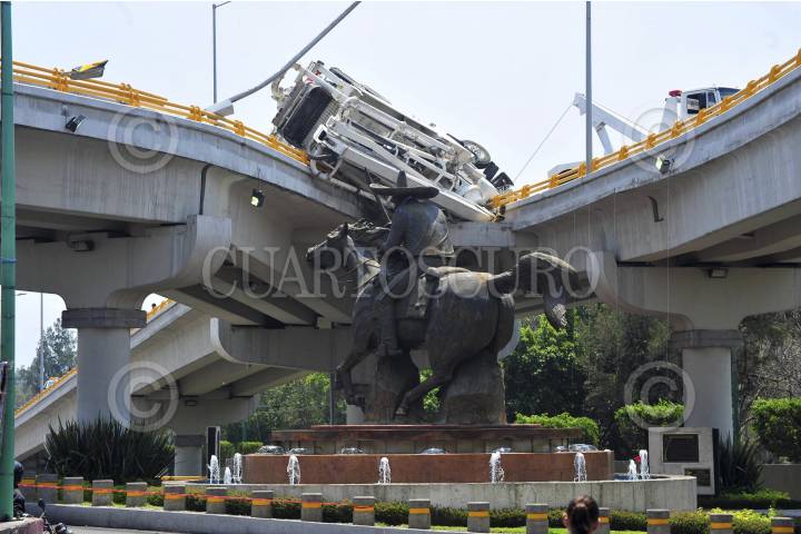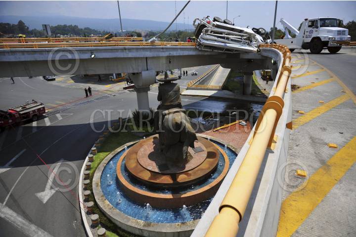 CUERNAVACA. MORELOS, 18MAYO2013.- Un camión de carga se volcó justo en la entrada de la ciudad en el segundo nivel del puente vehicular, a la altura de la iconica escultura de Emiliano Zapata, el conductor sufrió lesiones tras caer de una altura de nueve metros. FOTO: ALMA LAFAYET /CUARTOSCURO.COM