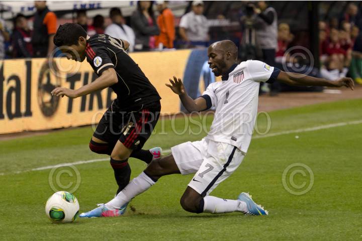 MÉXICO, D.F., 26MARZO2013.- Javier Aquino es derribado por DaMarcus Beasley, durante el partido correspondiente a la Hexagonal Final de la eliminatoria a la Copa Mundial Fifa Brasil 2014 entre México vs Estados Unidos y llevado acabo en el estadio Azteca. FOTO: MISAEL VALTIERRA / CUARTOSCURO.COM