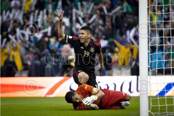 MÉXICO, D.F., 06SEPTIEMBRE2013.- Oribe Peralta (México), festeja el primer gol del equipo mexicano durante el partido correspondiente a la jornada 7 de la Hexagonal Final de la Eliminatoria rumboa a Brazil 2014 entre México y Honduras y llevado acabo en el estadio Azteca. FOTO: MISAEL VALTIERRA / CUARTOSCURO.COM