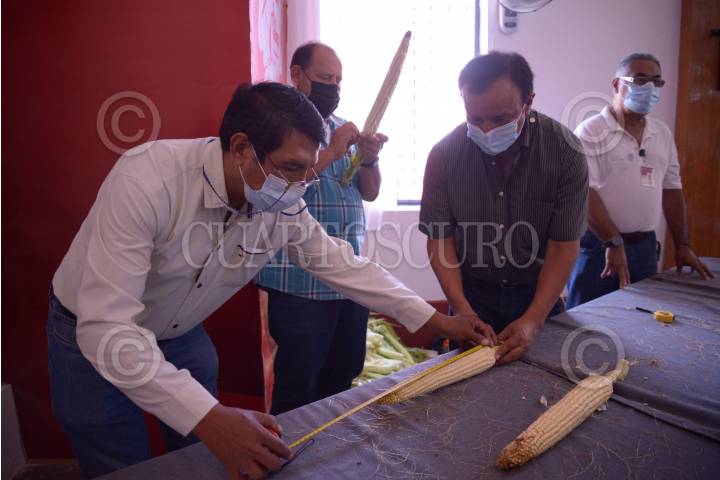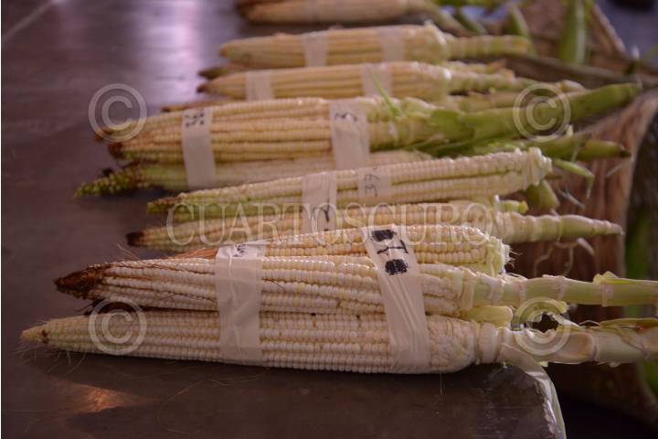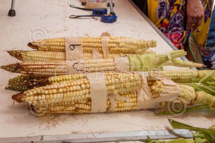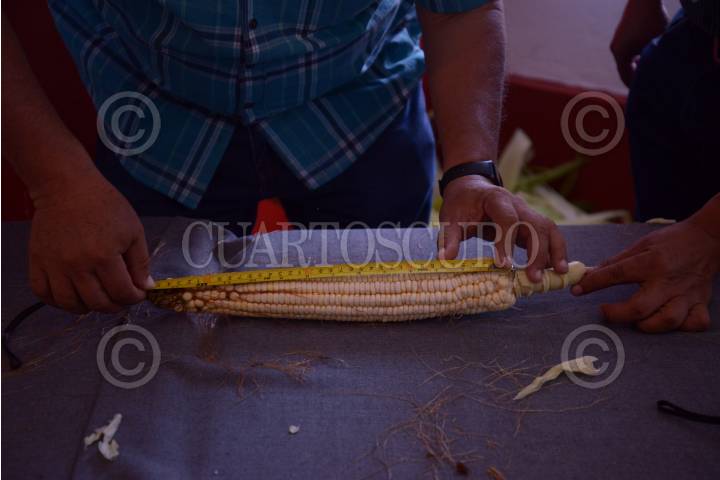 Ejemplares de elotes durante la calificación del concurso del Elote más Grande del Mundo.